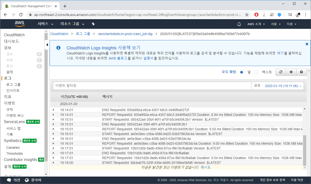 4. 더불어, Lambda의 활동을 기록하는 Cloud Watch에서도 Lambda가 일을 잘 수행하는지 확인할 수 있습니다.