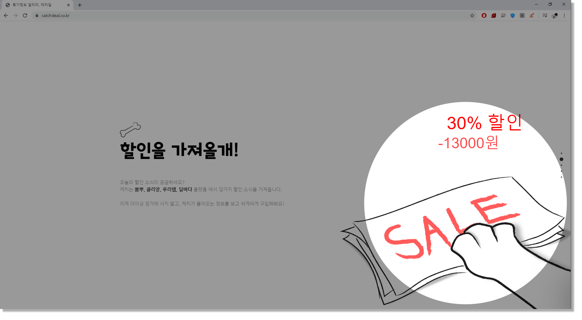 홍보페이지에 있어 캐치딜이 할인 데이터 정보를 가져온다는 소개와 함께, 뭔가 할인정보를 가득 담아온다는 느낌의 일러스트가 필요한 상황이었습니다.