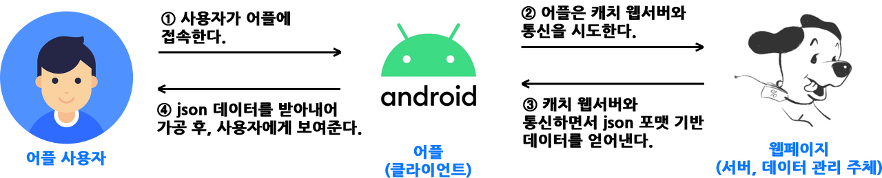 캐치딜 앱에 보여지는 자료들은 앱 내에서 Database가 남겨져 있는 형식이 아닌, 앱에서 웹과의 통신을 통해 웹이 가지고 있는 Database 내 자료를 json으로 받아내어 데이터 결과를 보여주는 방식입니다.
