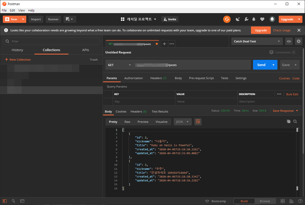 6. 더미데이터 생성이 끝난 후, 캐싱이 되기 전 속도를 알아보고자 API 통신을 해보겠습니다.