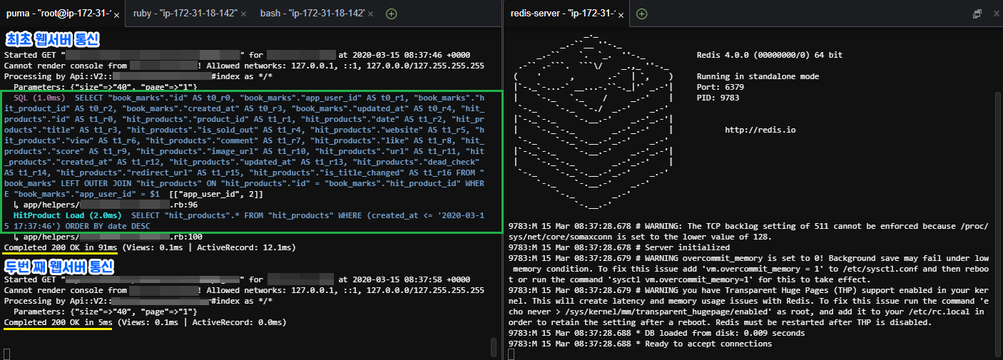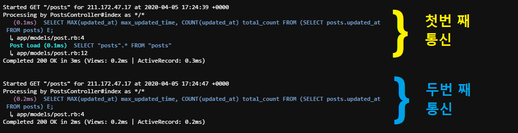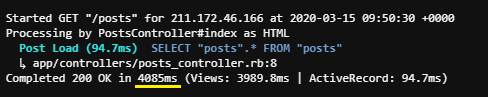 통신 후 Rails 콘솔에서 로그기록을 보면 서버 접속까지 4085ms(약 4초)가 걸렸습니다..