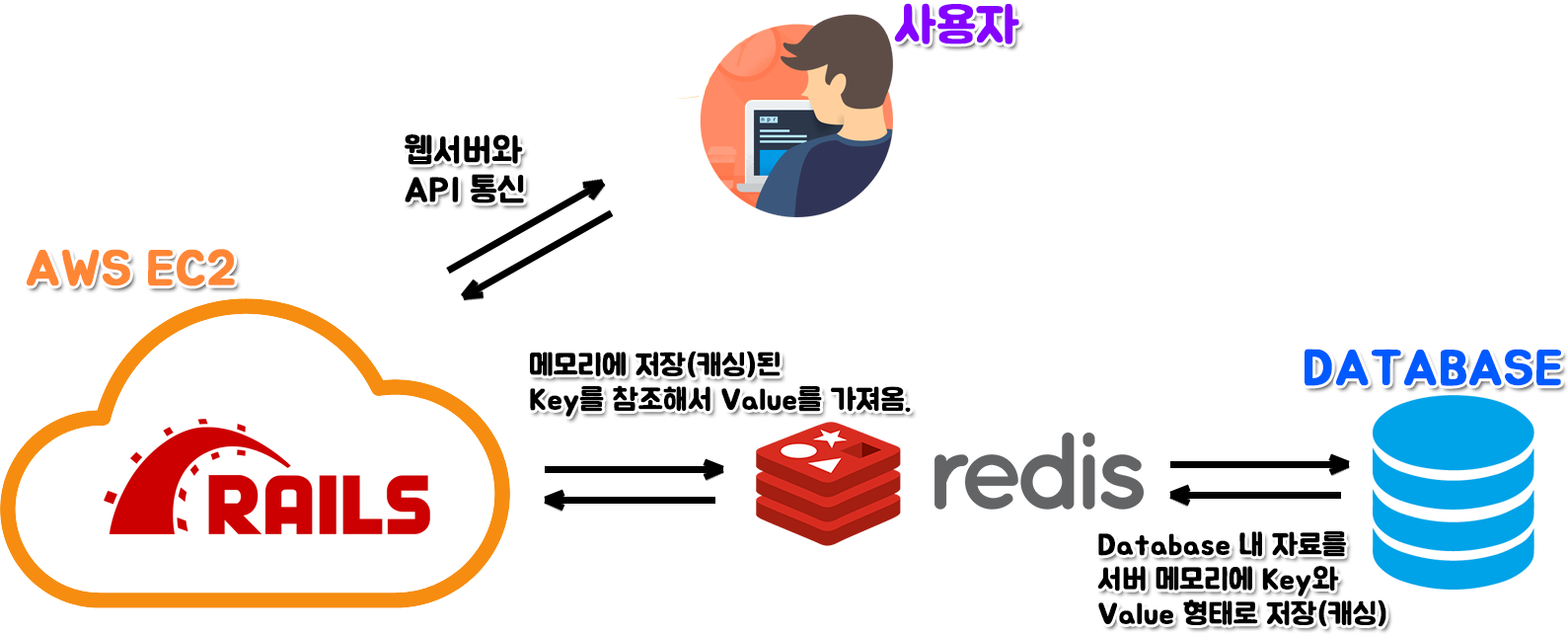 최초에 웹서버에 접속할 때에는 DB서버를 참조를 하지만, 이 때 DB서버를 참조를 하면서 메모리에 Key-Value로 이루어진 데이터를 저장하게 됩니다.