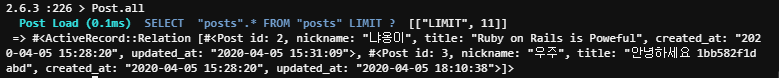 참고 모든 데이터를 불러오는 all 메소드 같은 경우는 Active Record::Relation 형식입니다.