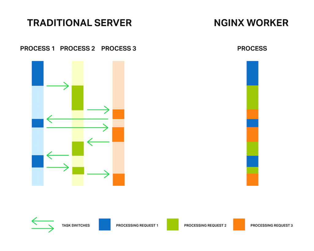 Nginx는 요청에 대한 작업을 처리할 때, 스레드가 직접적으로 작업을 하진 않고 이 작업들을 '이벤트 핸들러' 라는 곳으로 보냅니다.