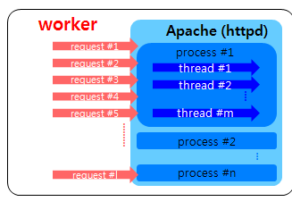 과거 Prefork 방식과 다르게 Request >= Process 구조로 이루어져 있는 Worker 방식입니다.