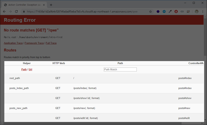URL을 잘못 입력 했을 시, 위와같이 Routes 규칙이 보입니다.