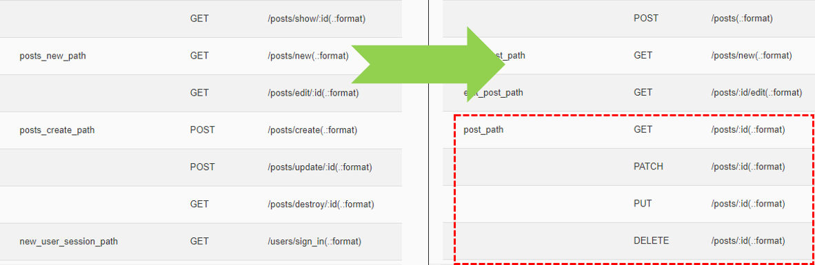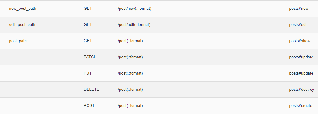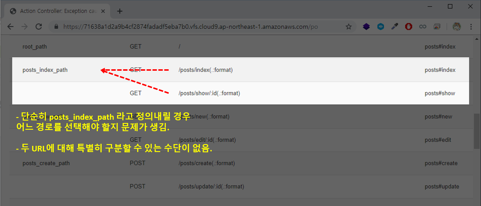예를들어, 위 사진을 보면 /posts/index와 /posts/show/:id는 동일한 라우터헬퍼를 가르키고 있는 상황입니다.