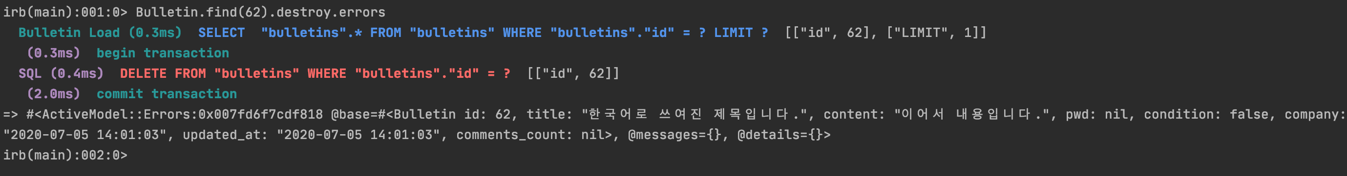 2. 한국어로 쓰여진 데이터를 배제하고 데이터 검증하는데에 있어 destroy 메소드를 통해 데이터를 삭제를 하고싶은 상황이 있습니다.