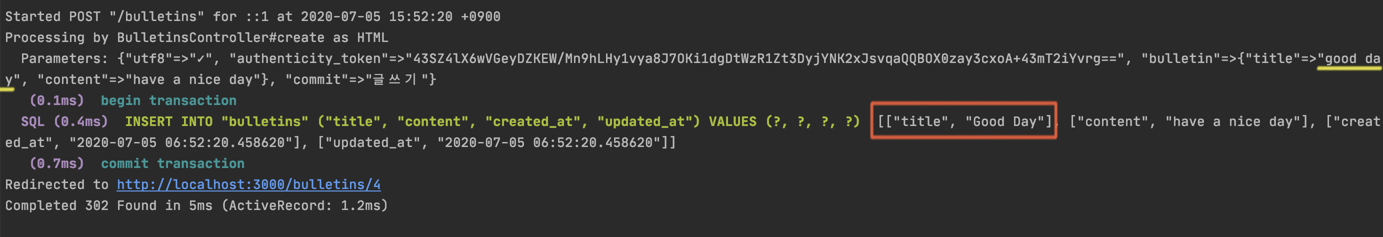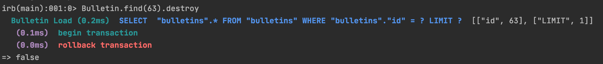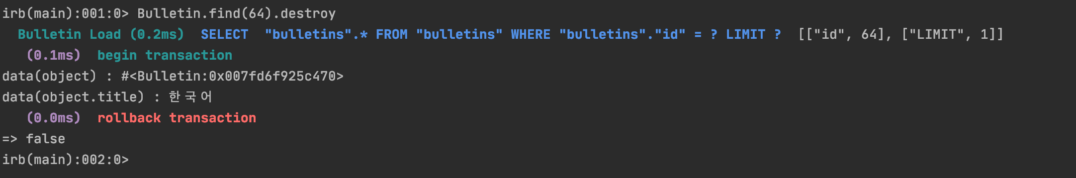 위와같이 throw 조건을 두어 처리할 경우, throw(:abort) 코드를 만나는 시점에서 SQL 내부에서는 rollback(데이터 작업 실패)와 함께 작업을 종료할겁니다.