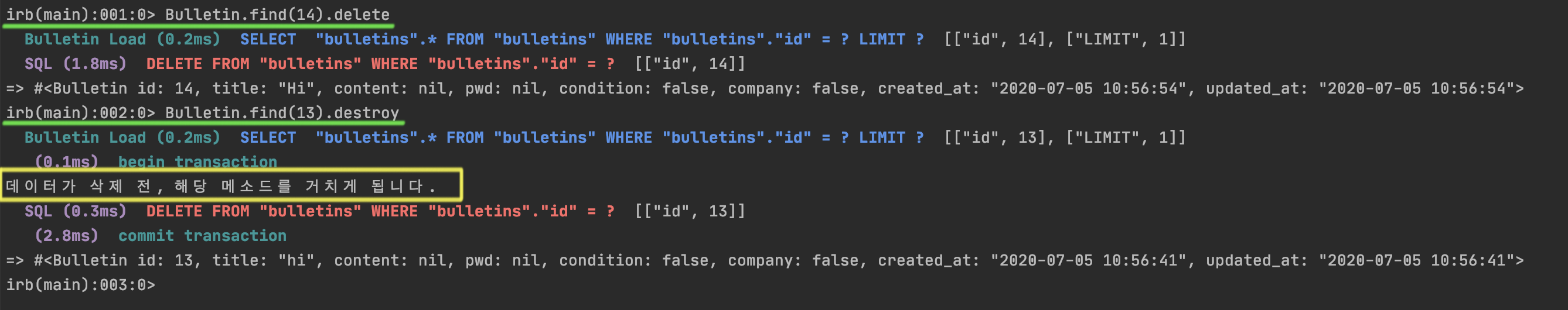 4. 만약 데이터 삭제에 있어 유효성 규칙을 위반할 경우, 데이터가 삭제되는 것을 막는 방법(prohibit commit)은 throw(:abort) 코드를 추가하는 겁니다.