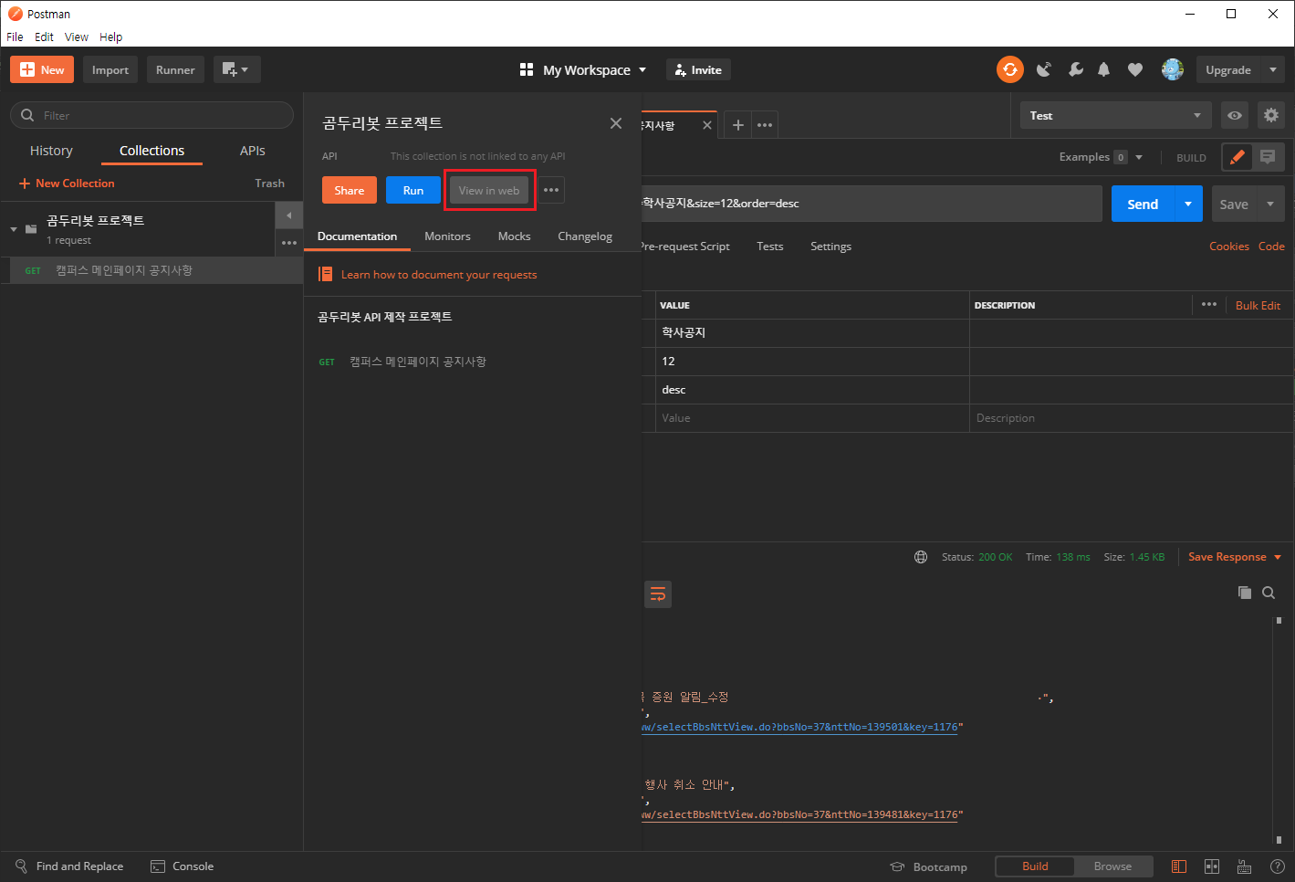 13. View in web 버튼을 클릭하면, 아래와 같이 API가 문서화된 웹페이지로 이동되는 것을 확인할 수 있습니다!