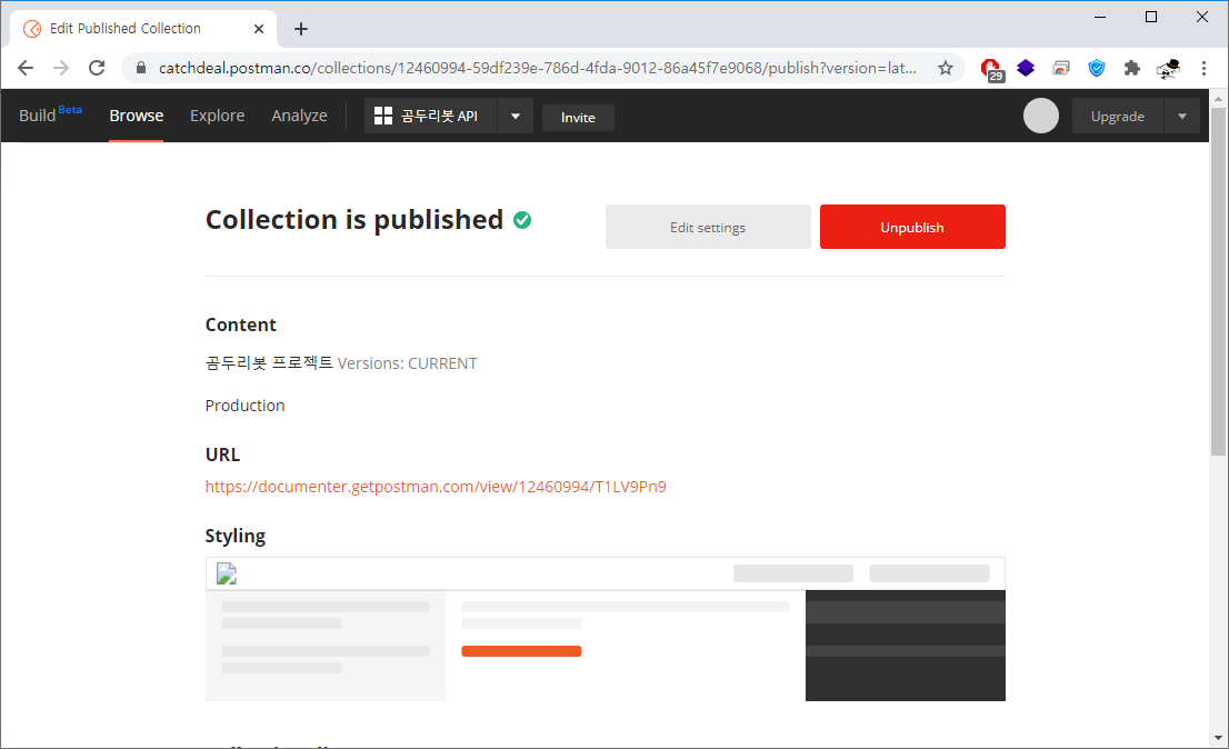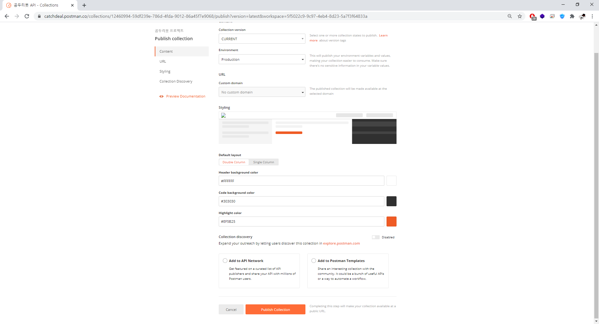 준비됐다면 설정페이지 하단에 보이는 Publish Collection 버튼을 클릭합니다.