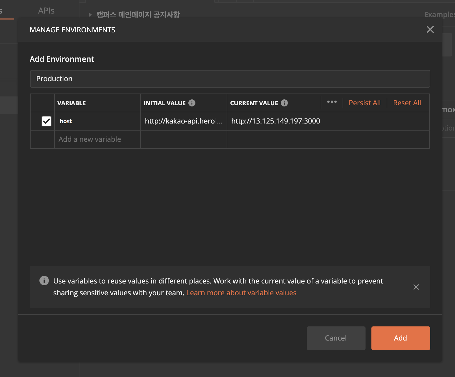 CURRENT VALUE POSTMAN 프로그램 내에서 host 변수에 등록될 값