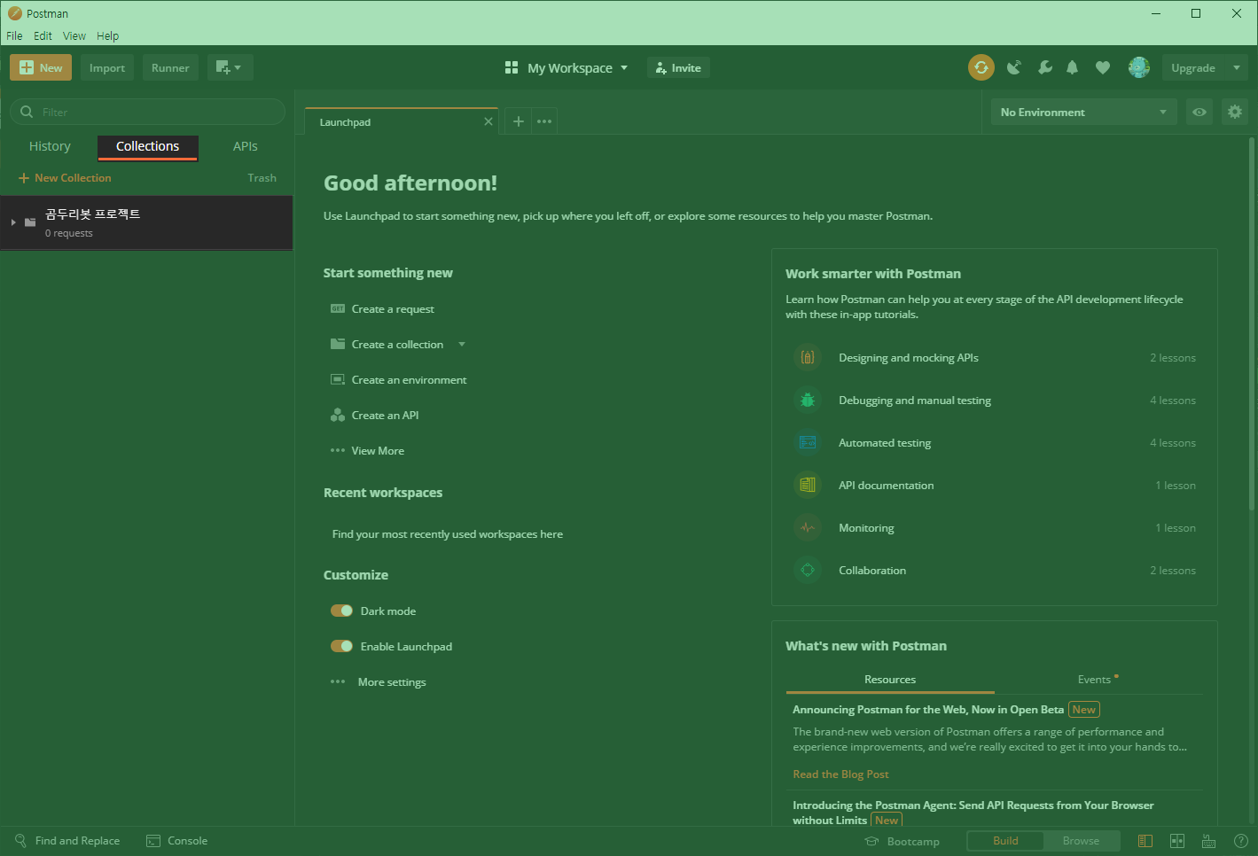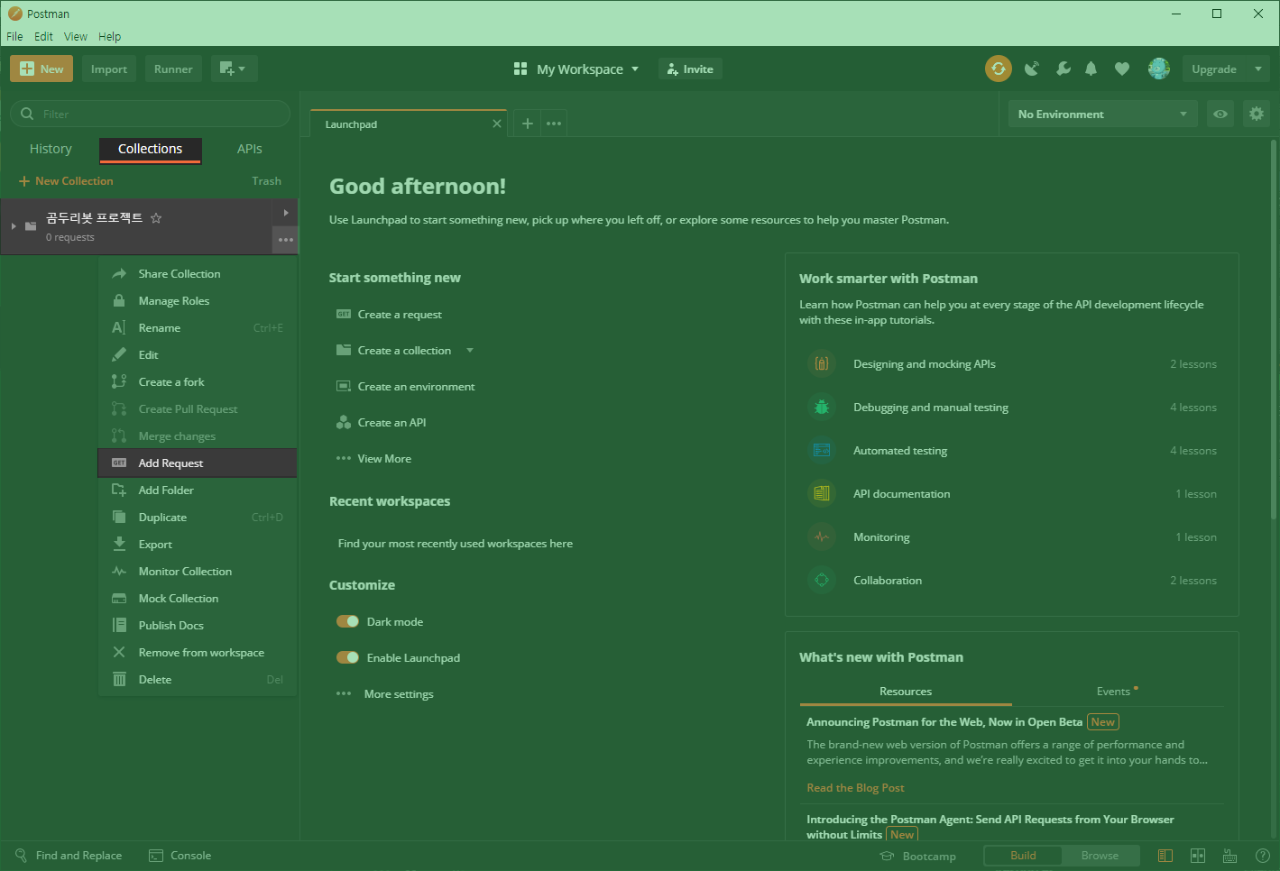 1. POSTMAN 프로그램에서 좌측에 보이는 Collections를 클릭합니다.