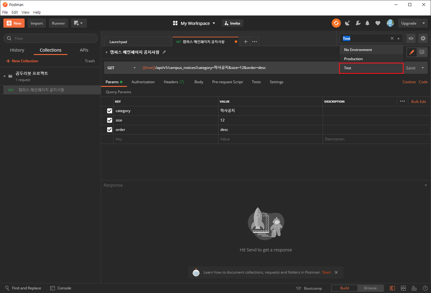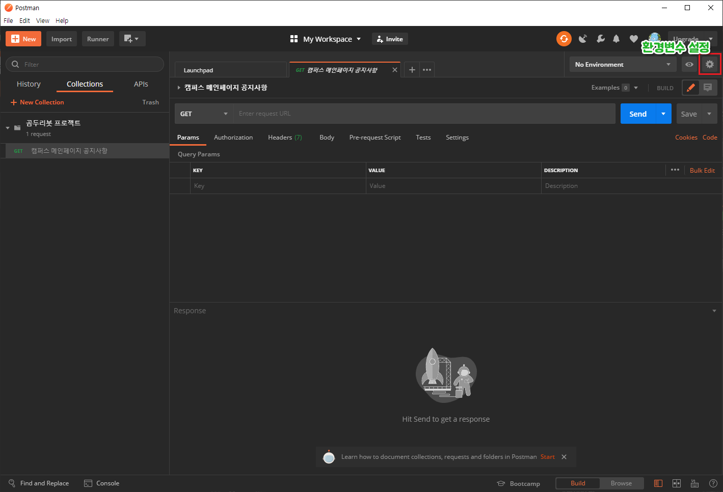 7. 잠시 Request에 대해 상세히 편집하기 전, 잠시 환경변수를 생성해보겠습니다.