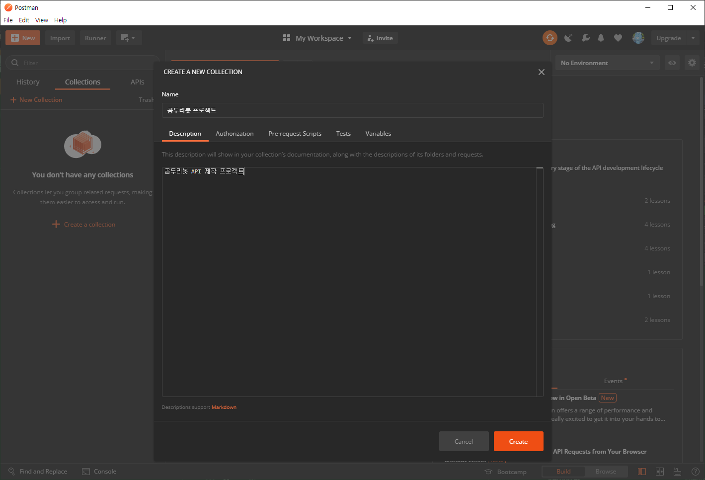 2. 새로운 Collections(메인 폴더)를 하나 생성합니다.