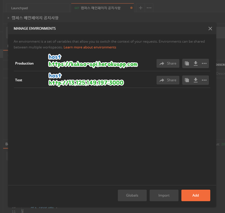 9. 그렇게 저는 총 2개의 Environment를 추가했습니다.