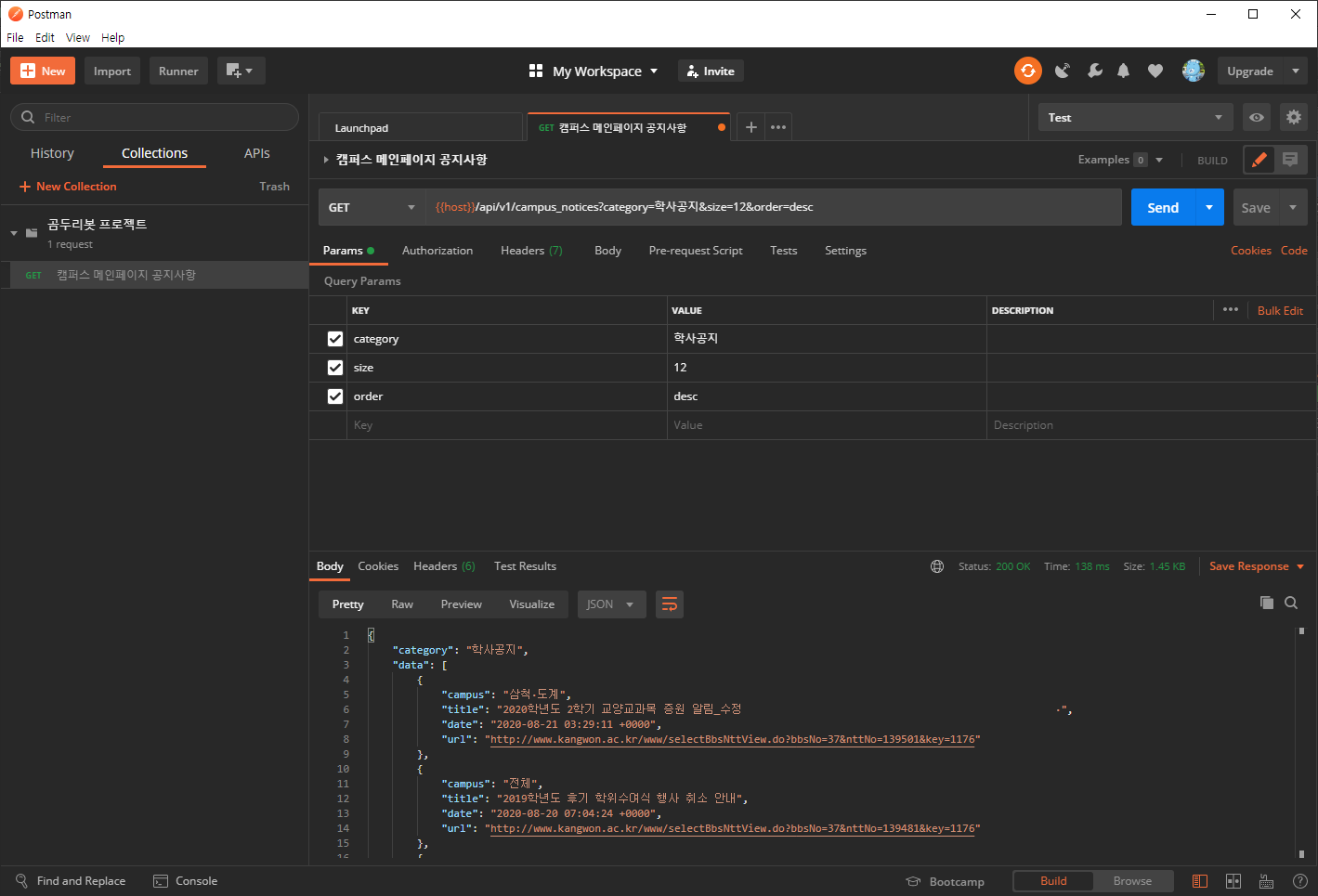 11. 이제 요청 후, 아래와 같이 Response를 확인할 수 있습니다.