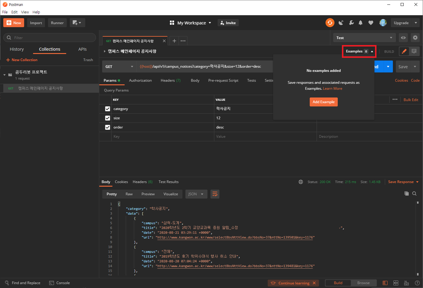 1. POSTMAN에서 Request 하나를 들어간 후, Examples 를 클릭합니다.