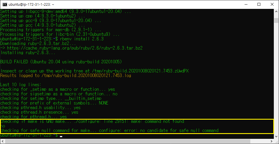 참고 5 만약 아래와 같이 에러가 발생한 메세지 중 make: command not found 을 확인할 수 있을것입니다. 이는 make 명령어 관련된 패키지 설치가 안되었다는 것을 보여줍니다.