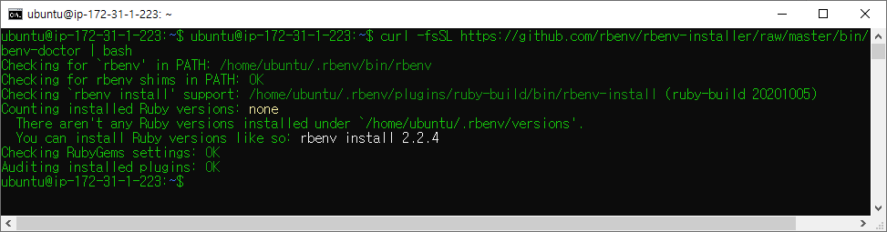 4. 아래 명령어를 통해 rbenv가 제대로 설치했는지 확인합니다.