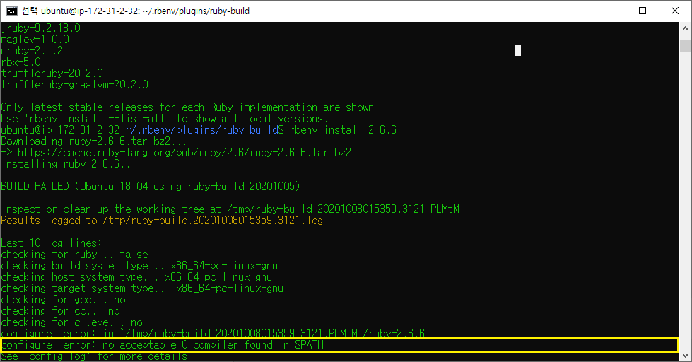 참고 4 만약 아래와 같이 에러가 발생한 메세지 중 no acceptable C compiler found in $PATH, 을 확인할 수 있을것입니다. 이는 C compiler가 설치가 안되었다는 것을 보여줍니다.