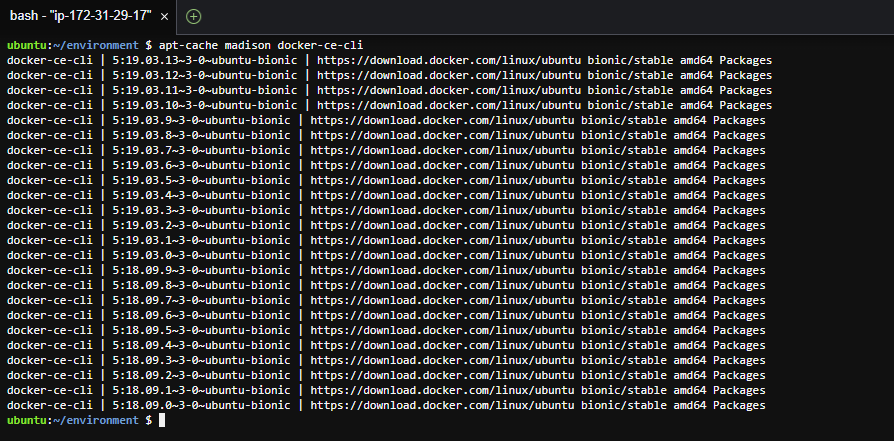 sudo apt-get install docker-ce=5:19.03.13~3-0~ubuntu-bionic docker-ce-cli=5:19.03.13~3-0~ubuntu-bionic containerd.io