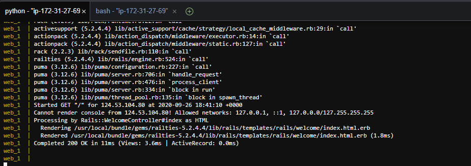 다음과 같이 Docker을 통해 띄어진 서버에서 Rails 서버가 돌아가고 있는 것을 볼 수 있습니다.