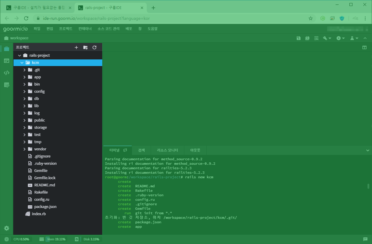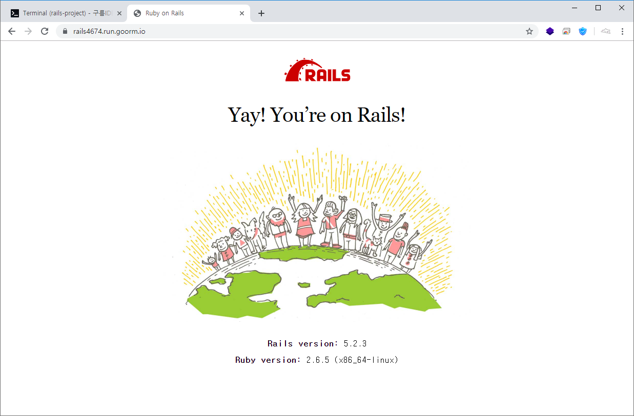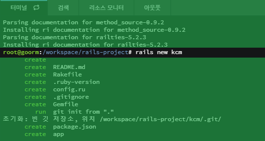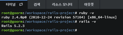 약 3분의 시간이 지나면 rails 또한 설치가 된게 확인될 겁니다.