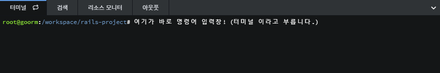 레일즈 프로젝트를 제어하기 위해선 터미널 위치를 레일즈 프로젝트가 있는 곳으로 이동해줘야 합니다.