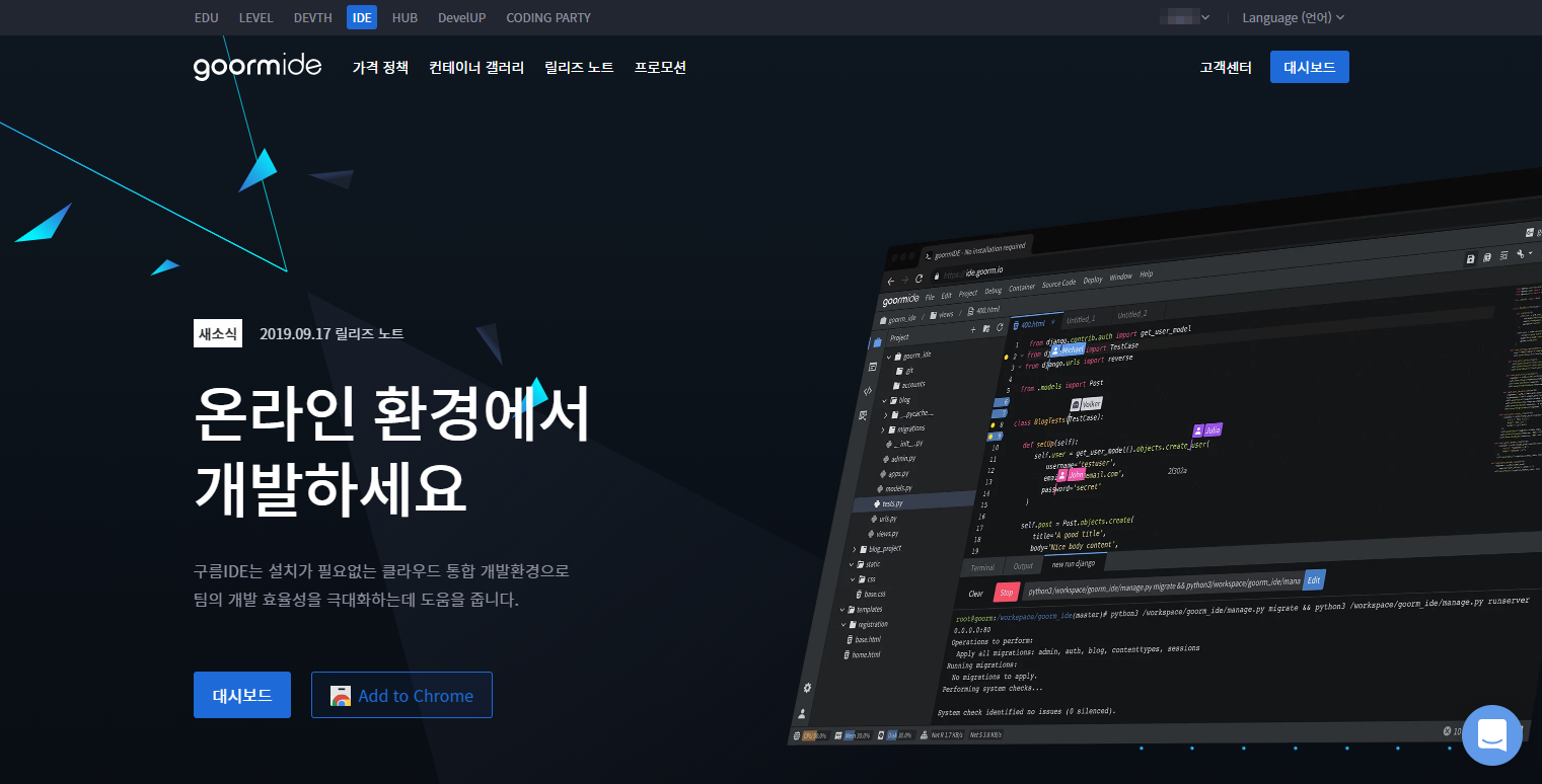 구름IDE는 클라우드IDE를 제공하는 국내 서비스 중 하나로서, 다양한 언어에 대한 IDE 지원 및 실제 테스트를 해볼 수 있는 환경까지 갖춰져 있습니다!