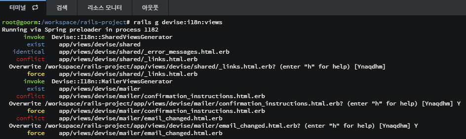 참고 만약 이미 Devise View파일이 있다보니, Conflict 에러가 생겼으나, 덮어씌어도 된다면 y+엔터 로 덮어씌어서 생성해주세요.