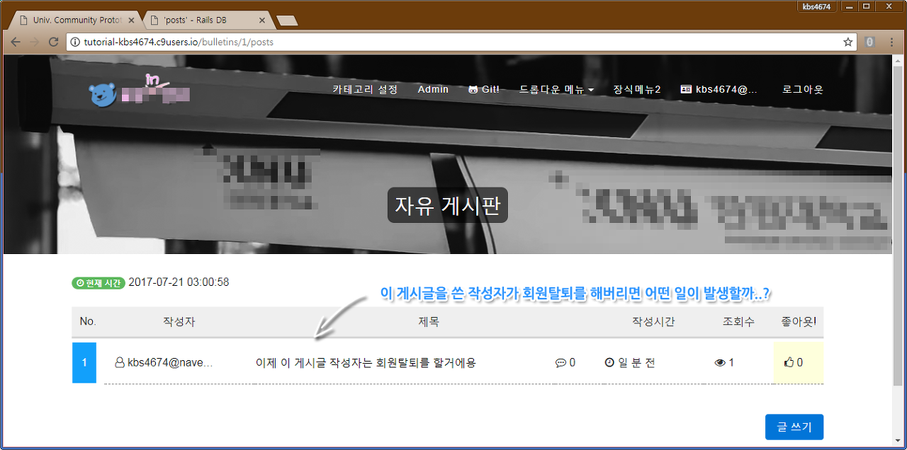 해당 부분이 이해가 안가는 부분은 Devise와 연계되는 Scaffold 게시판 제작[클릭] 글을 참고 해주세요.