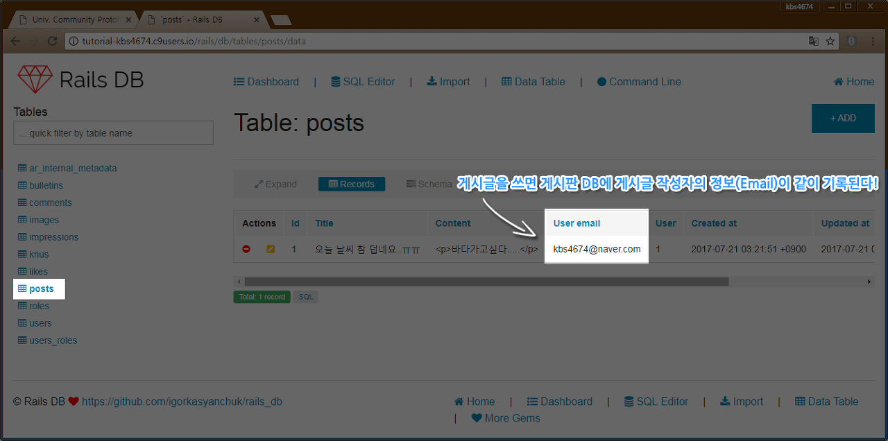 게시글을 하나 작성을 하고, Rails DB Gem을 통해 테이블 데이터를 확인해보면..