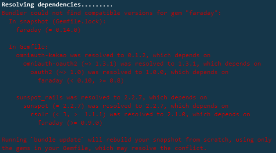 위 에러는 관련된 Gem(dependency) 들이 버전에 호환이 안되어서 발생되는 문제입니다.