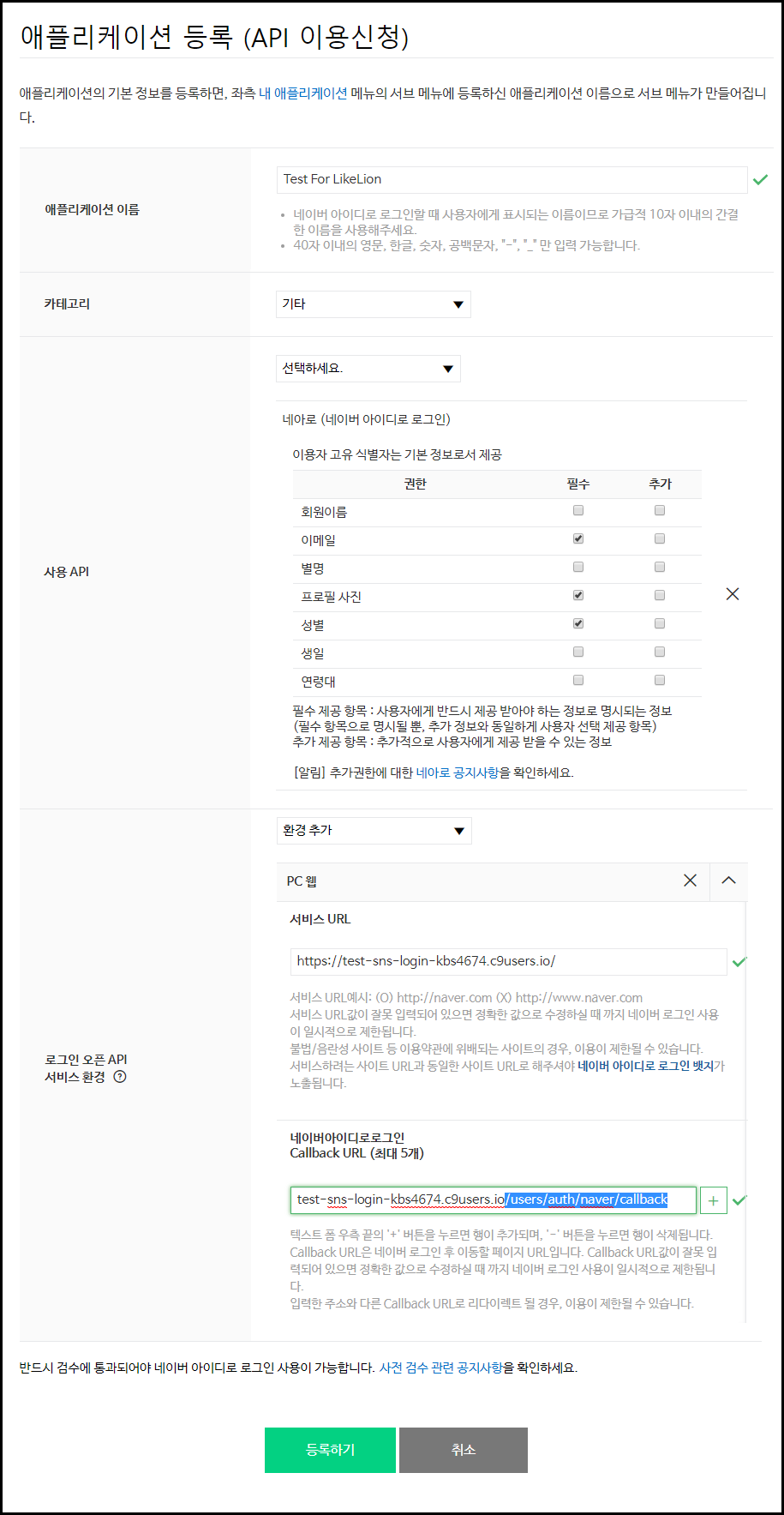- 서비스 URL : 네이버 로그인 연동을 할 자신의 홈페이지