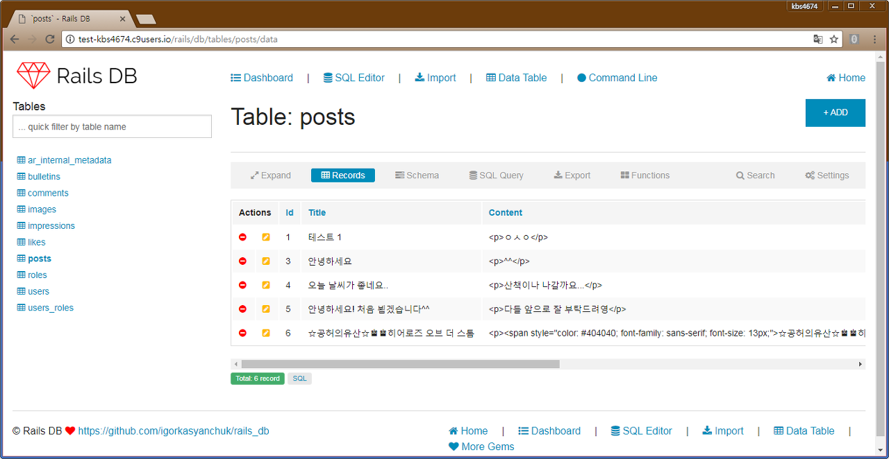 DB가 구현되었을 때 해당 DB에 어떠한 테이블 컬럼이 있는지, DB에 내용이 잘 적용되었는지, ... 등등 DB가 돌아가는것의 모든 정보를 한눈에 볼 수 있는 유용한 Gem입니다. 또한 DB를 Expert, 데이터 추가/수정/삭제 또한 가능합니다.