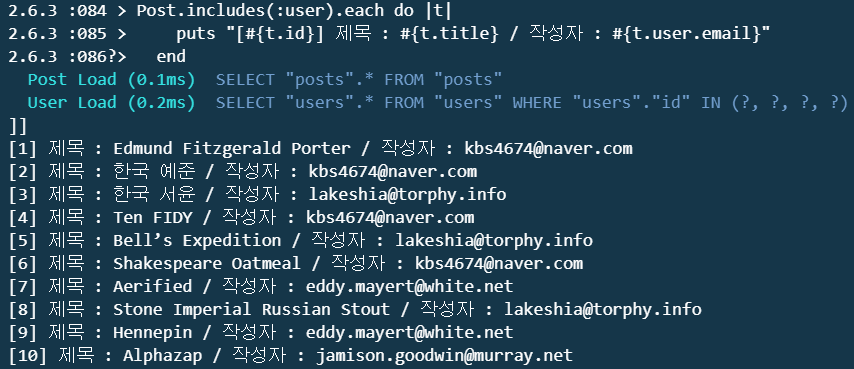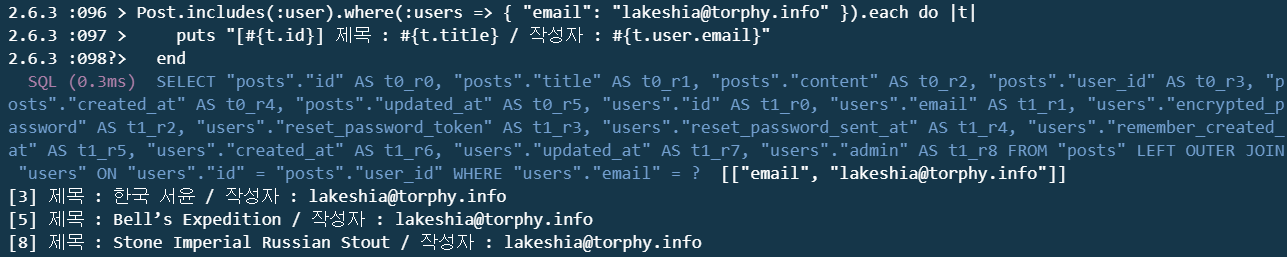 puts "[#{t.id}] 제목 : #{t.title} / 작성자 : #{t.user.email}"