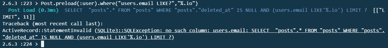 @data = Post.includes(:user).where(:users => { "email": "lakeshia@torphy.info" }).to_a
