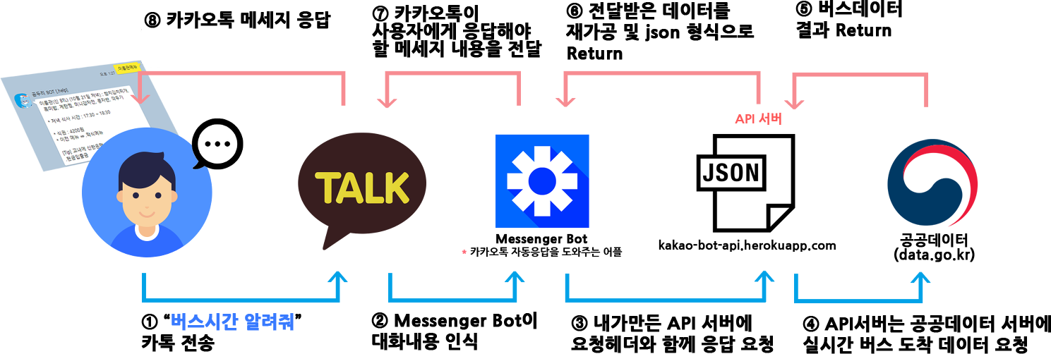 3) 반응값을 가진 API서버는 정보를 JSON 형식으로 재가공 후, 카카오봇에게 Return 합니다.