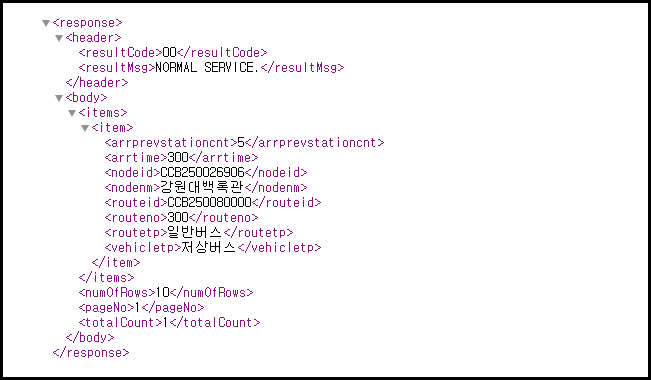 4. [도착정보조회서비스 : 노선별경유정류소목록조회] 도시코드 및 정류장 ID 기반 정류장 도착시간 데이터 조회
