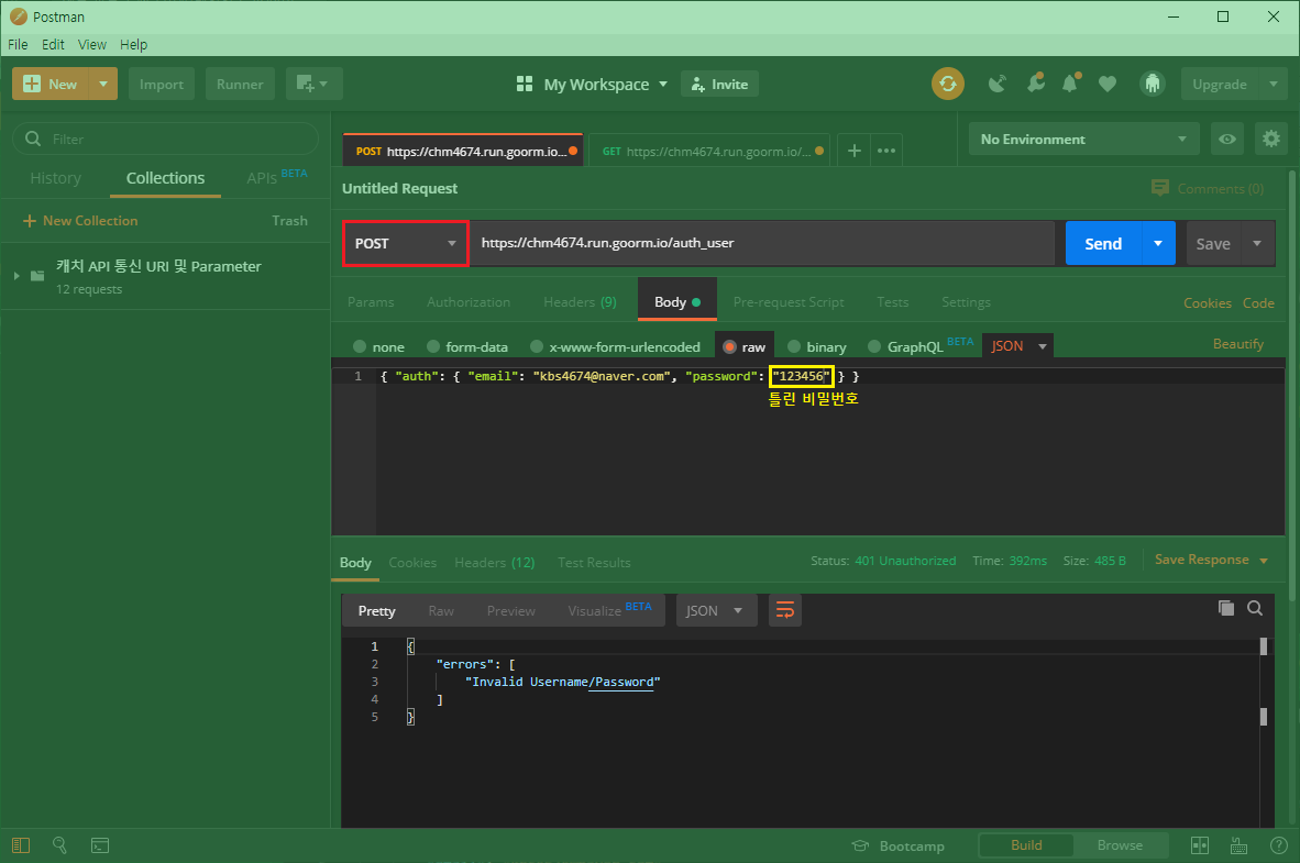 유효하지 않은 정보 입력 시 (Response 401)
