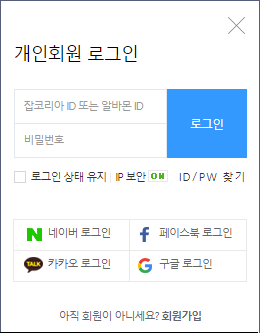잡코리아 사이트를 로그인을 할 때, 네이버 혹은 페이스북 계정을 이용해서 로그인이 이루어짐에 있어 계정 검증을 토큰이라는 것을 통해서 검증이 이루어집니다.