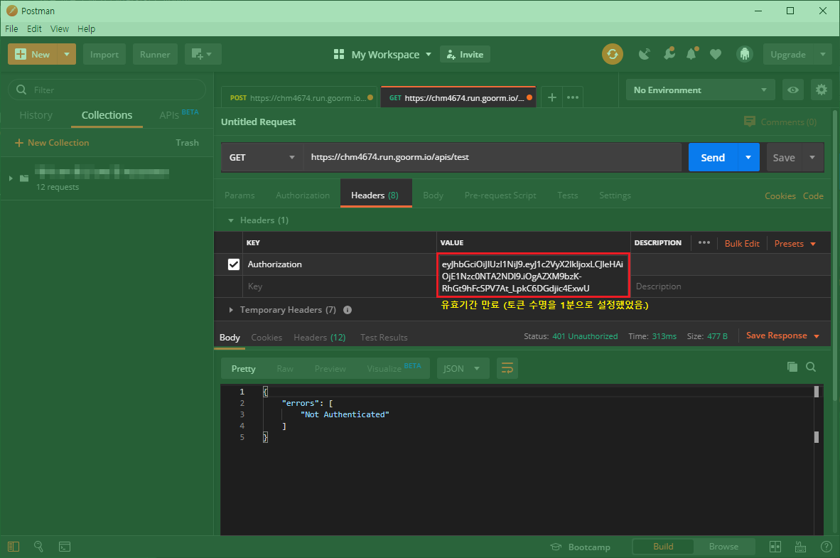 올바르지 않은 인증 (옳지 않은 토큰 난수 및 토큰 유효기간 만료)