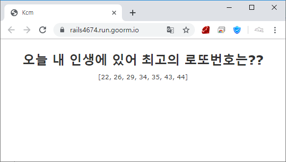 @lotto = @random.sample(7).sort # random 변수 내 있는 1~45 숫자 중 .sample(n)를 통해 n개의 랜덤정수를 뽑아냅니다. 그리고 .sort를 통해 오름차순 정렬을 합니다.