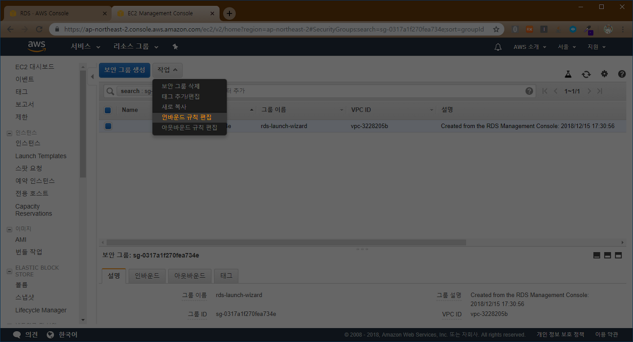 2) 보안그룹 설정 페이지에 가셔서 RDS 보안그룹(VPC)을 체크 후, 작업 메뉴에서 인바운드 규칙 편집 을 클릭합니다.