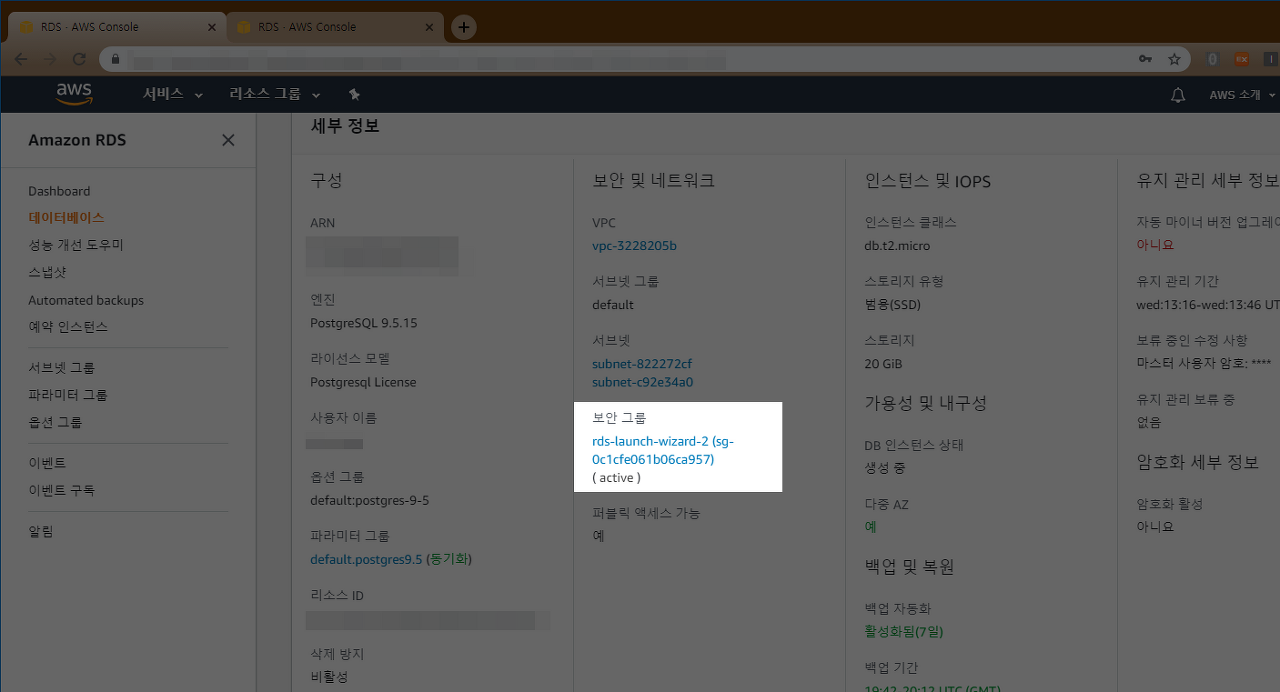 1) RDS Dashboard에 보시면 방금 전 생성시킨 자신의 RDS가 보이는데, 보안그룹의 명칭(링크)을 클릭해서 보안그룹 설정으로 이동합니다.
