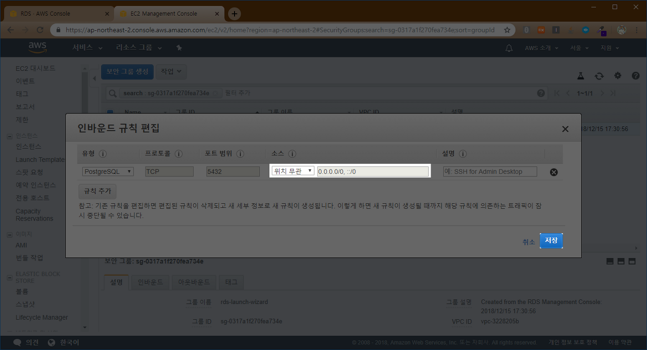 RDS가 생성될 동안, PostgreSQL 인바운드 규칙을 수정하겠습니다.