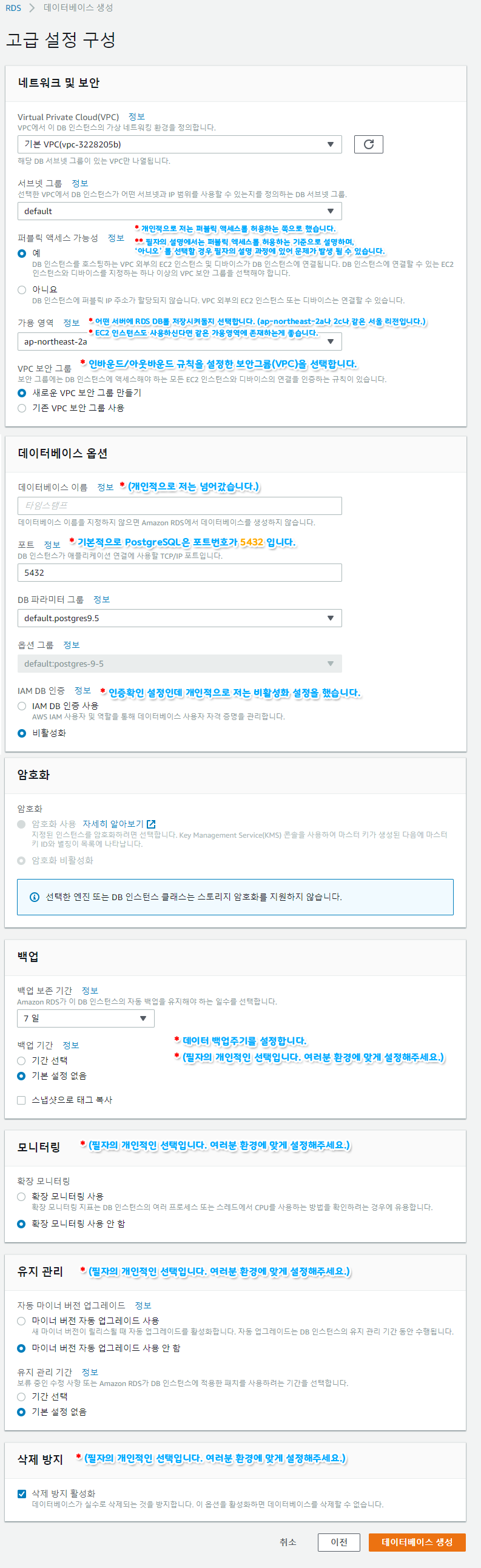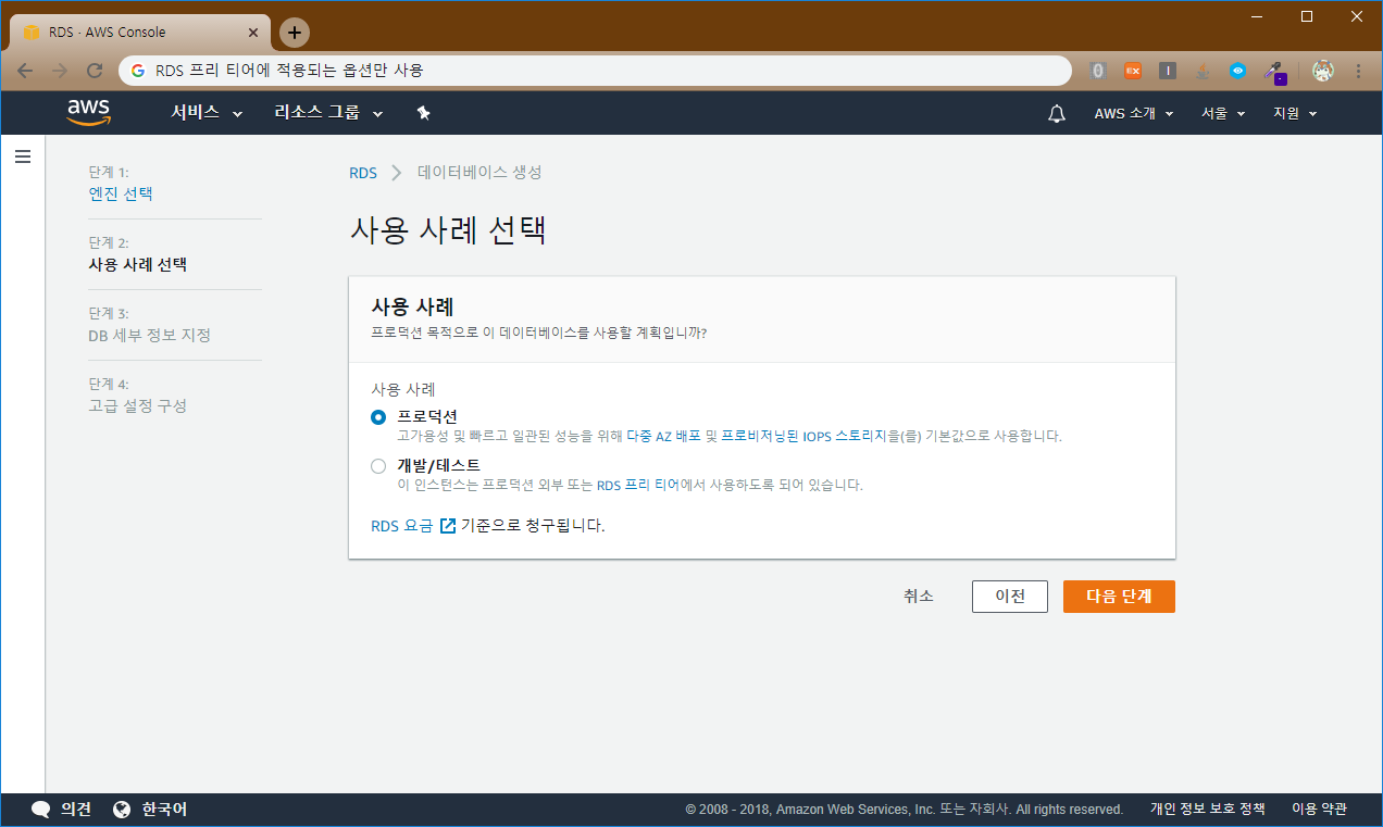 참고 2 하단에 RDS 프리 티어에 적용되는 옵션만 사용 체크 옵션은 무시해도 됩니다.